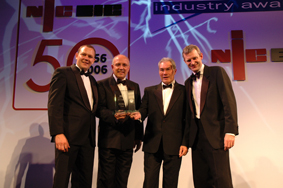 John Quick and Peter Fairclough (left and right of centre) collecting the award at the Electrical Industry Awards Gala Dinner at London's Grosvenor House Hotel. |